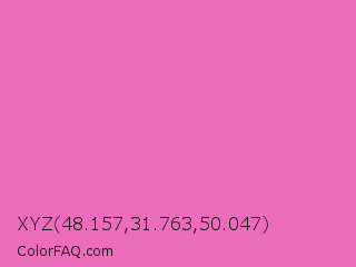 XYZ 48.157,31.763,50.047 Color is a light magenta color and the nearest color is Hot Pink #ff69b4. Hex code #ea6cba and RGB value is rgb(234,108,186). In RGB color space, this color is composed of 92% red, 42% green, 73% blue, In CMYK color space, this color is composed of 0% cyan, 54% magenta, 21% yellow , 8% black , In HSL color space, this color has a hue angle of 323° , 75% saturation and 67% lightness.