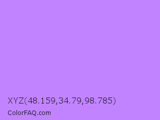 XYZ 48.159,34.79,98.785 Color is a light violet color and the nearest color is Pale Violet #cc99ff. Hex code #c183ff and RGB value is rgb(193,131,255). In RGB color space, this color is composed of 76% red, 51% green, 100% blue, In CMYK color space, this color is composed of 24% cyan, 49% magenta, 0% yellow , 0% black , In HSL color space, this color has a hue angle of 270° , 100% saturation and 76% lightness.
