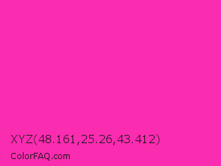 XYZ 48.161,25.26,43.412 Color is a normal magenta color and the nearest color is Persian Rose #fe28a2. Hex code #fa2cb0 and RGB value is rgb(250,44,176). In RGB color space, this color is composed of 98% red, 17% green, 69% blue, In CMYK color space, this color is composed of 0% cyan, 82% magenta, 30% yellow , 2% black , In HSL color space, this color has a hue angle of 322° , 95% saturation and 58% lightness.