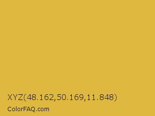 XYZ 48.162,50.169,11.848 Color is a normal yellow color and the nearest color is Anzac #e0b646. Hex code #deb83f and RGB value is rgb(222,184,63). In RGB color space, this color is composed of 87% red, 72% green, 25% blue, In CMYK color space, this color is composed of 0% cyan, 17% magenta, 72% yellow , 13% black , In HSL color space, this color has a hue angle of 46° , 71% saturation and 56% lightness.