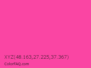 XYZ 48.163,27.225,37.367 Color is a light rose color and the nearest color is Wild Strawberry #ff43a4. Hex code #fa45a3 and RGB value is rgb(250,69,163). In RGB color space, this color is composed of 98% red, 27% green, 64% blue, In CMYK color space, this color is composed of 0% cyan, 72% magenta, 35% yellow , 2% black , In HSL color space, this color has a hue angle of 329° , 95% saturation and 63% lightness.