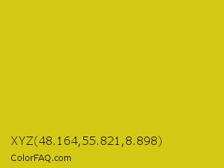 XYZ 48.164,55.821,8.898 Color is a normal yellow color and the nearest color is Bird Flower #d4cd16. Hex code #d4c914 and RGB value is rgb(212,201,20). In RGB color space, this color is composed of 83% red, 79% green, 8% blue, In CMYK color space, this color is composed of 0% cyan, 5% magenta, 91% yellow , 17% black , In HSL color space, this color has a hue angle of 57° , 83% saturation and 45% lightness.