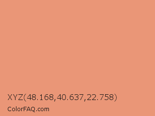 XYZ 48.168,40.637,22.758 Color is a light orange color and the nearest color is Dark Salmon #e9967a. Hex code #ea9677 and RGB value is rgb(234,150,119). In RGB color space, this color is composed of 92% red, 59% green, 47% blue, In CMYK color space, this color is composed of 0% cyan, 36% magenta, 49% yellow , 8% black , In HSL color space, this color has a hue angle of 16° , 73% saturation and 69% lightness.