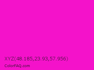 XYZ 48.185,23.93,57.956 Color is a normal magenta color and the nearest color is Shocking Pink #fc0fc0. Hex code #f412ca and RGB value is rgb(244,18,202). In RGB color space, this color is composed of 96% red, 7% green, 79% blue, In CMYK color space, this color is composed of 0% cyan, 93% magenta, 17% yellow , 4% black , In HSL color space, this color has a hue angle of 311° , 91% saturation and 51% lightness.