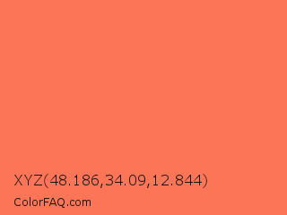 XYZ 48.186,34.09,12.844 Color is a light red color and the nearest color is Bittersweet #fe6f5e. Hex code #fc7556 and RGB value is rgb(252,117,86). In RGB color space, this color is composed of 99% red, 46% green, 34% blue, In CMYK color space, this color is composed of 0% cyan, 54% magenta, 66% yellow , 1% black , In HSL color space, this color has a hue angle of 11° , 97% saturation and 66% lightness.
