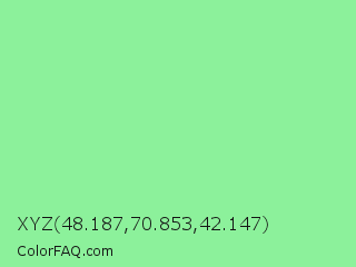 XYZ 48.187,70.853,42.147 Color is a light green color and the nearest color is Light Green #90ee90. Hex code #8cf19b and RGB value is rgb(140,241,155). In RGB color space, this color is composed of 55% red, 95% green, 61% blue, In CMYK color space, this color is composed of 42% cyan, 0% magenta, 36% yellow , 5% black , In HSL color space, this color has a hue angle of 129° , 78% saturation and 75% lightness.
