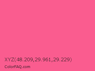 XYZ 48.209,29.961,29.229 Color is a light rose color and the nearest color is Strawberry #fc5a8d. Hex code #fa5c8f and RGB value is rgb(250,92,143). In RGB color space, this color is composed of 98% red, 36% green, 56% blue, In CMYK color space, this color is composed of 0% cyan, 63% magenta, 43% yellow , 2% black , In HSL color space, this color has a hue angle of 341° , 94% saturation and 67% lightness.