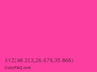 XYZ 48.213,26.679,35.866 Color is a light rose color and the nearest color is Rose Bonbon #f9429e. Hex code #fc3ea0 and RGB value is rgb(252,62,160). In RGB color space, this color is composed of 99% red, 24% green, 63% blue, In CMYK color space, this color is composed of 0% cyan, 75% magenta, 37% yellow , 1% black , In HSL color space, this color has a hue angle of 329° , 97% saturation and 62% lightness.
