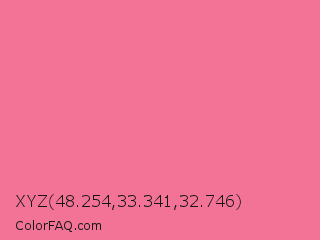 XYZ 48.254,33.341,32.746 Color is a light rose color and the nearest color is Light Crimson #f56991. Hex code #f27396 and RGB value is rgb(242,115,150). In RGB color space, this color is composed of 95% red, 45% green, 59% blue, In CMYK color space, this color is composed of 0% cyan, 52% magenta, 38% yellow , 5% black , In HSL color space, this color has a hue angle of 343° , 83% saturation and 70% lightness.