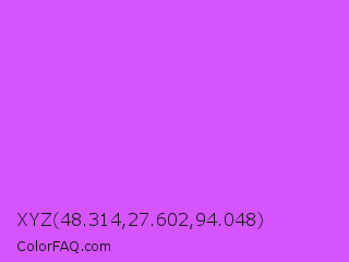 XYZ 48.314,27.602,94.048 Color is a light purple color and the nearest color is Heliotrope #df73ff. Hex code #d654fb and RGB value is rgb(214,84,251). In RGB color space, this color is composed of 84% red, 33% green, 98% blue, In CMYK color space, this color is composed of 15% cyan, 67% magenta, 0% yellow , 2% black , In HSL color space, this color has a hue angle of 287° , 95% saturation and 66% lightness.