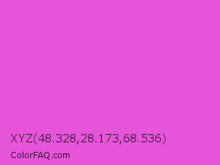 XYZ 48.328,28.173,68.536 Color is a light magenta color and the nearest color is Purple Pizzazz #fe4eda. Hex code #e654d9 and RGB value is rgb(230,84,217). In RGB color space, this color is composed of 90% red, 33% green, 85% blue, In CMYK color space, this color is composed of 0% cyan, 63% magenta, 6% yellow , 10% black , In HSL color space, this color has a hue angle of 305° , 74% saturation and 62% lightness.