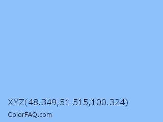 XYZ 48.349,51.515,100.324 Color is a light blue color and the nearest color is Light Sky Blue #87cefa. Hex code #8fc2fd and RGB value is rgb(143,194,253). In RGB color space, this color is composed of 56% red, 76% green, 99% blue, In CMYK color space, this color is composed of 43% cyan, 23% magenta, 0% yellow , 1% black , In HSL color space, this color has a hue angle of 212° , 96% saturation and 78% lightness.