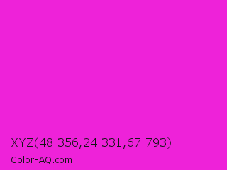 XYZ 48.356,24.331,67.793 Color is a normal magenta color and the nearest color is Hot Magenta #ff1dce. Hex code #ee22d9 and RGB value is rgb(238,34,217). In RGB color space, this color is composed of 93% red, 13% green, 85% blue, In CMYK color space, this color is composed of 0% cyan, 86% magenta, 9% yellow , 7% black , In HSL color space, this color has a hue angle of 306° , 86% saturation and 53% lightness.