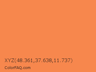 XYZ 48.361,37.638,11.737 Color is a light orange color and the nearest color is Coral #ff7f50. Hex code #f7874d and RGB value is rgb(247,135,77). In RGB color space, this color is composed of 97% red, 53% green, 30% blue, In CMYK color space, this color is composed of 0% cyan, 45% magenta, 69% yellow , 3% black , In HSL color space, this color has a hue angle of 20° , 91% saturation and 64% lightness.