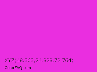XYZ 48.363,24.828,72.764 Color is a normal magenta color and the nearest color is Razzle Dazzle Rose #ff33cc. Hex code #ea2ee0 and RGB value is rgb(234,46,224). In RGB color space, this color is composed of 92% red, 18% green, 88% blue, In CMYK color space, this color is composed of 0% cyan, 80% magenta, 4% yellow , 8% black , In HSL color space, this color has a hue angle of 303° , 82% saturation and 55% lightness.
