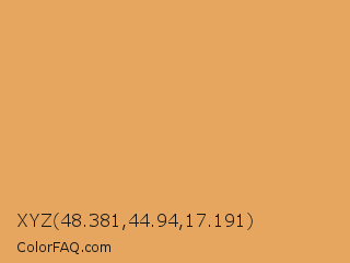 XYZ 48.381,44.94,17.191 Color is a light orange color and the nearest color is Earth Yellow #e1a95f. Hex code #e6a660 and RGB value is rgb(230,166,96). In RGB color space, this color is composed of 90% red, 65% green, 38% blue, In CMYK color space, this color is composed of 0% cyan, 28% magenta, 58% yellow , 10% black , In HSL color space, this color has a hue angle of 31° , 73% saturation and 64% lightness.