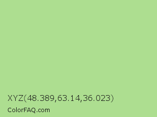 XYZ 48.389,63.14,36.023 Color is a light green color and the nearest color is Feijoa #9fdd8c. Hex code #adde90 and RGB value is rgb(173,222,144). In RGB color space, this color is composed of 68% red, 87% green, 56% blue, In CMYK color space, this color is composed of 22% cyan, 0% magenta, 35% yellow , 13% black , In HSL color space, this color has a hue angle of 98° , 54% saturation and 72% lightness.