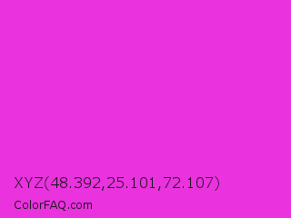 XYZ 48.392,25.101,72.107 Color is a normal magenta color and the nearest color is Razzle Dazzle Rose #ff33cc. Hex code #ea32df and RGB value is rgb(234,50,223). In RGB color space, this color is composed of 92% red, 20% green, 87% blue, In CMYK color space, this color is composed of 0% cyan, 79% magenta, 5% yellow , 8% black , In HSL color space, this color has a hue angle of 304° , 81% saturation and 56% lightness.
