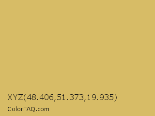 XYZ 48.406,51.373,19.935 Color is a light yellow color and the nearest color is Tacha #d6c562. Hex code #d7bc66 and RGB value is rgb(215,188,102). In RGB color space, this color is composed of 84% red, 74% green, 40% blue, In CMYK color space, this color is composed of 0% cyan, 13% magenta, 53% yellow , 16% black , In HSL color space, this color has a hue angle of 46° , 59% saturation and 62% lightness.