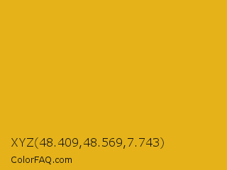 XYZ 48.409,48.569,7.743 Color is a normal orange color and the nearest color is Urobilin #e1ad21. Hex code #e5b219 and RGB value is rgb(229,178,25). In RGB color space, this color is composed of 90% red, 70% green, 10% blue, In CMYK color space, this color is composed of 0% cyan, 22% magenta, 89% yellow , 10% black , In HSL color space, this color has a hue angle of 45° , 80% saturation and 50% lightness.