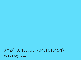 XYZ 48.411,61.704,101.454 Color is a light cyan color and the nearest color is Turquoise Blue #6cdae7. Hex code #5fdefc and RGB value is rgb(95,222,252). In RGB color space, this color is composed of 37% red, 87% green, 99% blue, In CMYK color space, this color is composed of 62% cyan, 12% magenta, 0% yellow , 1% black , In HSL color space, this color has a hue angle of 191° , 96% saturation and 68% lightness.