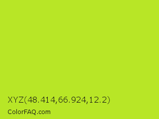 XYZ 48.414,66.924,12.2 Color is a normal lime color and the nearest color is Inch Worm #b0e313. Hex code #b8e626 and RGB value is rgb(184,230,38). In RGB color space, this color is composed of 72% red, 90% green, 15% blue, In CMYK color space, this color is composed of 20% cyan, 0% magenta, 83% yellow , 10% black , In HSL color space, this color has a hue angle of 74° , 79% saturation and 53% lightness.
