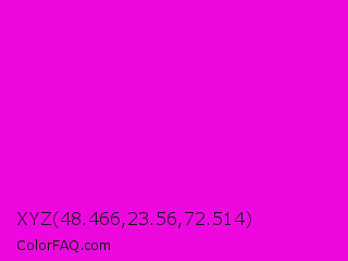XYZ 48.466,23.56,72.514 Color is a normal magenta color and the nearest color is Purple Pizzazz #ff00cc. Hex code #ed08e0 and RGB value is rgb(237,8,224). In RGB color space, this color is composed of 93% red, 3% green, 88% blue, In CMYK color space, this color is composed of 0% cyan, 97% magenta, 5% yellow , 7% black , In HSL color space, this color has a hue angle of 303° , 93% saturation and 48% lightness.