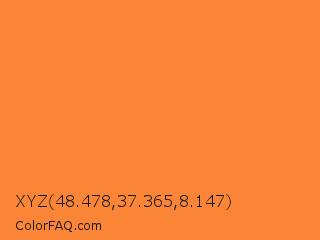 XYZ 48.478,37.365,8.147 Color is a normal orange color and the nearest color is Crusta #fd7b33. Hex code #fa8536 and RGB value is rgb(250,133,54). In RGB color space, this color is composed of 98% red, 52% green, 21% blue, In CMYK color space, this color is composed of 0% cyan, 47% magenta, 78% yellow , 2% black , In HSL color space, this color has a hue angle of 24° , 95% saturation and 60% lightness.