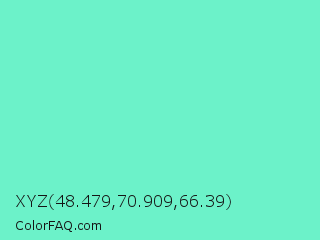 XYZ 48.479,70.909,66.39 Color is a light green color and the nearest color is Aquamarine #7fffd4. Hex code #6cf2c9 and RGB value is rgb(108,242,201). In RGB color space, this color is composed of 42% red, 95% green, 79% blue, In CMYK color space, this color is composed of 55% cyan, 0% magenta, 17% yellow , 5% black , In HSL color space, this color has a hue angle of 162° , 84% saturation and 69% lightness.