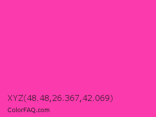 XYZ 48.48,26.367,42.069 Color is a normal magenta color and the nearest color is Wild Strawberry #ff43a4. Hex code #fa3aad and RGB value is rgb(250,58,173). In RGB color space, this color is composed of 98% red, 23% green, 68% blue, In CMYK color space, this color is composed of 0% cyan, 77% magenta, 31% yellow , 2% black , In HSL color space, this color has a hue angle of 324° , 95% saturation and 60% lightness.