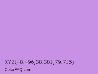 XYZ 48.496,38.381,79.715 Color is a light purple color and the nearest color is Bright Lavender #bf94e4. Hex code #c991e6 and RGB value is rgb(201,145,230). In RGB color space, this color is composed of 79% red, 57% green, 90% blue, In CMYK color space, this color is composed of 13% cyan, 37% magenta, 0% yellow , 10% black , In HSL color space, this color has a hue angle of 280° , 63% saturation and 74% lightness.