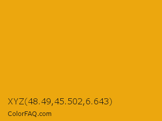 XYZ 48.49,45.502,6.643 Color is a normal orange color and the nearest color is Buttercup #f3ad16. Hex code #eca70e and RGB value is rgb(236,167,14). In RGB color space, this color is composed of 93% red, 65% green, 5% blue, In CMYK color space, this color is composed of 0% cyan, 29% magenta, 94% yellow , 7% black , In HSL color space, this color has a hue angle of 41° , 89% saturation and 49% lightness.