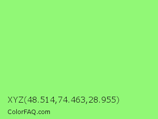 XYZ 48.514,74.463,28.955 Color is a light green color and the nearest color is Light Green #90ee90. Hex code #91f876 and RGB value is rgb(145,248,118). In RGB color space, this color is composed of 57% red, 97% green, 46% blue, In CMYK color space, this color is composed of 42% cyan, 0% magenta, 52% yellow , 3% black , In HSL color space, this color has a hue angle of 108° , 90% saturation and 72% lightness.