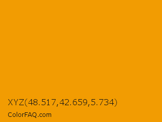 XYZ 48.517,42.659,5.734 Color is a normal orange color and the nearest color is Orange RYB #fb9902. Hex code #f29c02 and RGB value is rgb(242,156,2). In RGB color space, this color is composed of 95% red, 61% green, 1% blue, In CMYK color space, this color is composed of 0% cyan, 36% magenta, 99% yellow , 5% black , In HSL color space, this color has a hue angle of 39° , 98% saturation and 48% lightness.