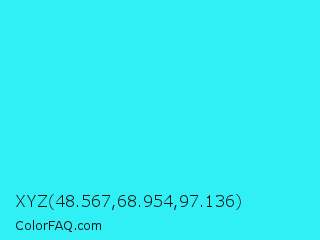 XYZ 48.567,68.954,97.136 Color is a normal cyan color and the nearest color is Loeen #15f2fd. Hex code #30eff5 and RGB value is rgb(48,239,245). In RGB color space, this color is composed of 19% red, 94% green, 96% blue, In CMYK color space, this color is composed of 80% cyan, 2% magenta, 0% yellow , 4% black , In HSL color space, this color has a hue angle of 182° , 91% saturation and 57% lightness.