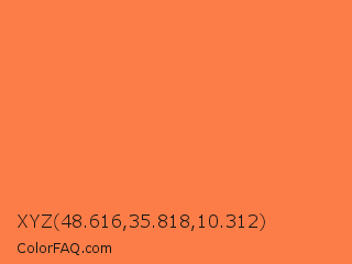 XYZ 48.616,35.818,10.312 Color is a light orange color and the nearest color is Mango Tango #ff8243. Hex code #fc7d47 and RGB value is rgb(252,125,71). In RGB color space, this color is composed of 99% red, 49% green, 28% blue, In CMYK color space, this color is composed of 0% cyan, 50% magenta, 72% yellow , 1% black , In HSL color space, this color has a hue angle of 18° , 97% saturation and 63% lightness.