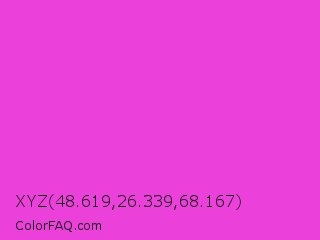 XYZ 48.619,26.339,68.167 Color is a normal magenta color and the nearest color is Purple Pizzazz #fe4eda. Hex code #eb40d9 and RGB value is rgb(235,64,217). In RGB color space, this color is composed of 92% red, 25% green, 85% blue, In CMYK color space, this color is composed of 0% cyan, 73% magenta, 8% yellow , 8% black , In HSL color space, this color has a hue angle of 306° , 81% saturation and 59% lightness.
