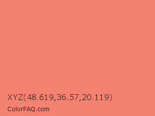 XYZ 48.619,36.57,20.119 Color is a light red color and the nearest color is Salmon #fa8072. Hex code #f58271 and RGB value is rgb(245,130,113). In RGB color space, this color is composed of 96% red, 51% green, 44% blue, In CMYK color space, this color is composed of 0% cyan, 47% magenta, 54% yellow , 4% black , In HSL color space, this color has a hue angle of 8° , 87% saturation and 70% lightness.