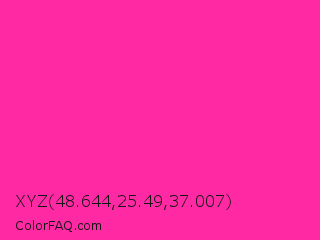 XYZ 48.644,25.49,37.007 Color is a normal magenta color and the nearest color is Persian Rose #fe28a2. Hex code #ff29a3 and RGB value is rgb(255,41,163). In RGB color space, this color is composed of 100% red, 16% green, 64% blue, In CMYK color space, this color is composed of 0% cyan, 84% magenta, 36% yellow , 0% black , In HSL color space, this color has a hue angle of 326° , 100% saturation and 58% lightness.