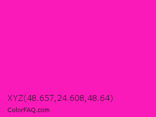 XYZ 48.657,24.608,48.64 Color is a normal magenta color and the nearest color is Shocking Pink #fc0fc0. Hex code #fa1aba and RGB value is rgb(250,26,186). In RGB color space, this color is composed of 98% red, 10% green, 73% blue, In CMYK color space, this color is composed of 0% cyan, 90% magenta, 26% yellow , 2% black , In HSL color space, this color has a hue angle of 317° , 96% saturation and 54% lightness.