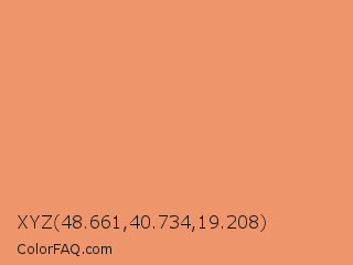XYZ 48.661,40.734,19.208 Color is a light orange color and the nearest color is Apricot #eb9373. Hex code #ee956b and RGB value is rgb(238,149,107). In RGB color space, this color is composed of 93% red, 58% green, 42% blue, In CMYK color space, this color is composed of 0% cyan, 37% magenta, 55% yellow , 7% black , In HSL color space, this color has a hue angle of 19° , 79% saturation and 68% lightness.