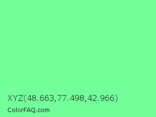XYZ 48.663,77.498,42.966 Color is a light green color and the nearest color is Very Light Malachite Green #64e986. Hex code #73ff9a and RGB value is rgb(115,255,154). In RGB color space, this color is composed of 45% red, 100% green, 60% blue, In CMYK color space, this color is composed of 55% cyan, 0% magenta, 40% yellow , 0% black , In HSL color space, this color has a hue angle of 137° , 100% saturation and 73% lightness.