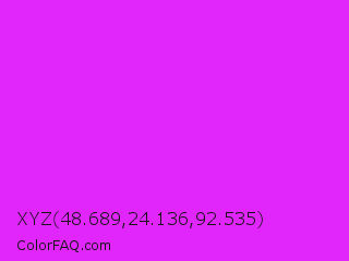 XYZ 48.689,24.136,92.535 Color is a normal magenta color and the nearest color is Phlox #df00ff. Hex code #e026fa and RGB value is rgb(224,38,250). In RGB color space, this color is composed of 88% red, 15% green, 98% blue, In CMYK color space, this color is composed of 10% cyan, 85% magenta, 0% yellow , 2% black , In HSL color space, this color has a hue angle of 293° , 95% saturation and 56% lightness.
