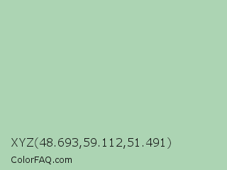 XYZ 48.693,59.112,51.491 Color is a light green color and the nearest color is Spring Rain #accbb1. Hex code #acd4b3 and RGB value is rgb(172,212,179). In RGB color space, this color is composed of 67% red, 83% green, 70% blue, In CMYK color space, this color is composed of 19% cyan, 0% magenta, 16% yellow , 17% black , In HSL color space, this color has a hue angle of 131° , 32% saturation and 75% lightness.