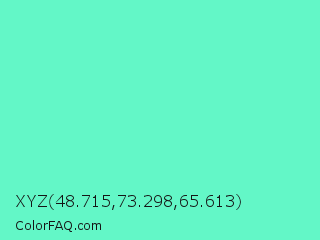 XYZ 48.715,73.298,65.613 Color is a light green color and the nearest color is Aquamarine #7fffd4. Hex code #63f7c7 and RGB value is rgb(99,247,199). In RGB color space, this color is composed of 39% red, 97% green, 78% blue, In CMYK color space, this color is composed of 60% cyan, 0% magenta, 19% yellow , 3% black , In HSL color space, this color has a hue angle of 161° , 90% saturation and 68% lightness.