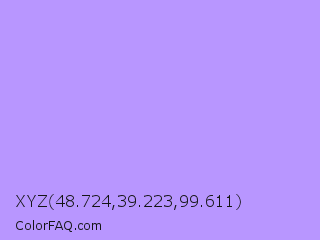 XYZ 48.724,39.223,99.611 Color is a light indigo color and the nearest color is Pale Violet #cc99ff. Hex code #b896ff and RGB value is rgb(184,150,255). In RGB color space, this color is composed of 72% red, 59% green, 100% blue, In CMYK color space, this color is composed of 28% cyan, 41% magenta, 0% yellow , 0% black , In HSL color space, this color has a hue angle of 259° , 100% saturation and 79% lightness.