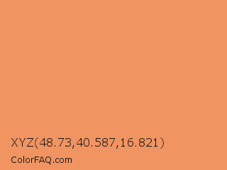 XYZ 48.73,40.587,16.821 Color is a light orange color and the nearest color is Big Foot Feet #e88e5a. Hex code #f09462 and RGB value is rgb(240,148,98). In RGB color space, this color is composed of 94% red, 58% green, 38% blue, In CMYK color space, this color is composed of 0% cyan, 38% magenta, 59% yellow , 6% black , In HSL color space, this color has a hue angle of 21° , 83% saturation and 66% lightness.