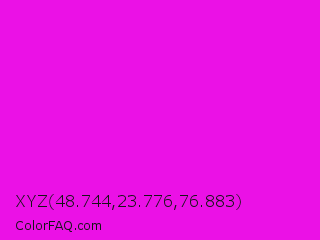 XYZ 48.744,23.776,76.883 Color is a normal magenta color and the nearest color is Phlox #df00ff. Hex code #eb11e6 and RGB value is rgb(235,17,230). In RGB color space, this color is composed of 92% red, 7% green, 90% blue, In CMYK color space, this color is composed of 0% cyan, 93% magenta, 2% yellow , 8% black , In HSL color space, this color has a hue angle of 301° , 87% saturation and 49% lightness.