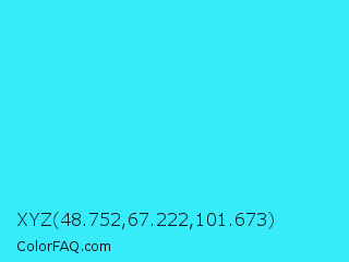 XYZ 48.752,67.222,101.673 Color is a normal cyan color and the nearest color is Loeen #15f2fd. Hex code #38ebfb and RGB value is rgb(56,235,251). In RGB color space, this color is composed of 22% red, 92% green, 98% blue, In CMYK color space, this color is composed of 78% cyan, 6% magenta, 0% yellow , 2% black , In HSL color space, this color has a hue angle of 185° , 96% saturation and 60% lightness.