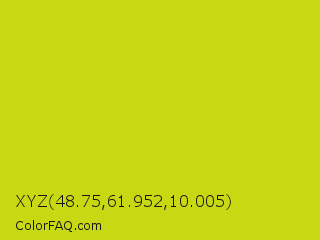 XYZ 48.75,61.952,10.005 Color is a normal yellow color and the nearest color is Bitter Lemon #cae00d. Hex code #c8d913 and RGB value is rgb(200,217,19). In RGB color space, this color is composed of 78% red, 85% green, 7% blue, In CMYK color space, this color is composed of 8% cyan, 0% magenta, 91% yellow , 15% black , In HSL color space, this color has a hue angle of 65° , 84% saturation and 46% lightness.